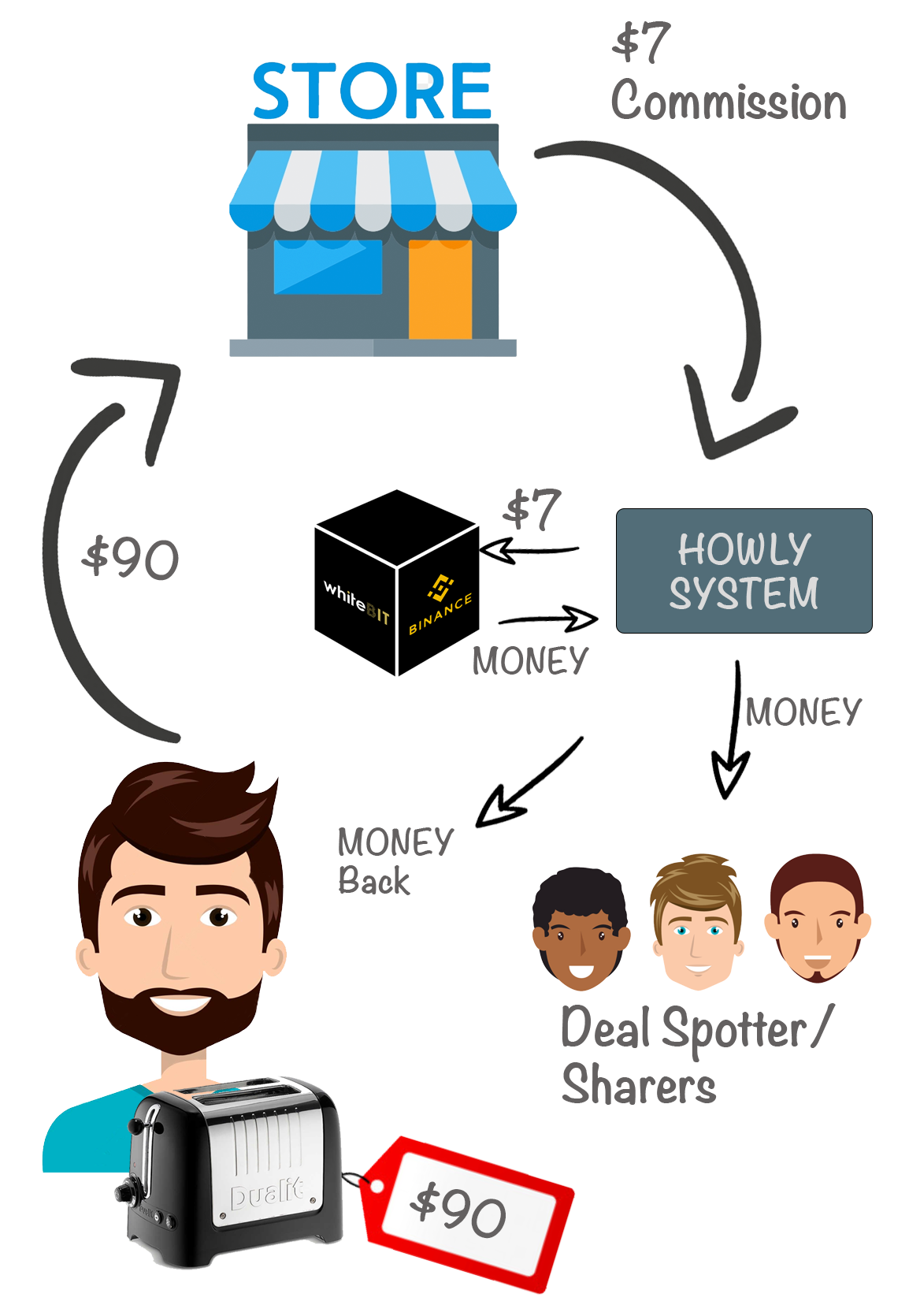 An example: a product sells for $90 with an affiliate commission of $7. We collect this commission and our system buys $7 of